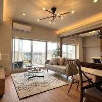 ホワイト×木目調の内装に、クロスやエコカラットのアクセントが効いたシンプルで温かみのあるリノベーション。 キッチンカウンターはあえて短くして、空いたスペースに可動棚を設置した。収納が増えるのはもちろんLDKの見た目もさらに華やかになった。 リビング横にみえる三枚引戸を開ければより一層開放的なお部屋に。