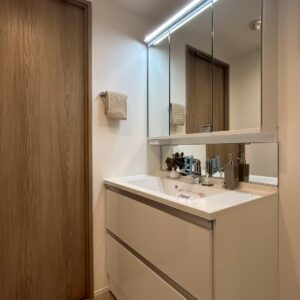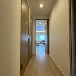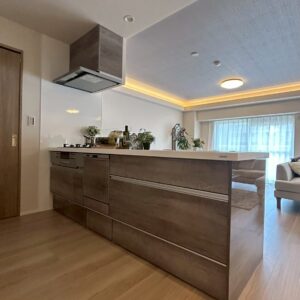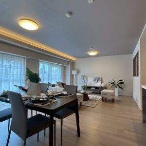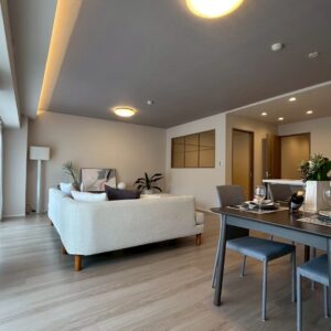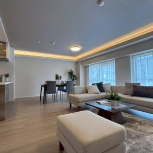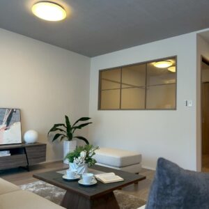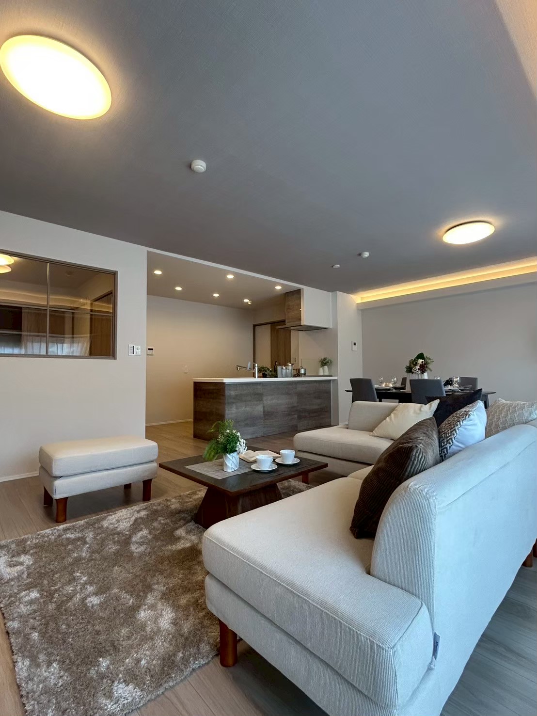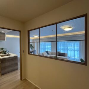 もともと和室だった空間を、現代のライフスタイルに合わせてリノベーションした事例です。LDKと洋室の間には室内窓を設け、開放的な設計に。ガラス越しにお子さまの様子を見守ることができ、安心感とデザイン性を両立しています。リビングの天井にはアクセントクロスと間接照明を施し、上品で落ち着いた雰囲気を演出。和室の面影を感じさせないモダンな仕上がりで、空間全体がすっきりと統一された印象に。暮らしのスタイルに合わせて住まいの価値を高めた、こだわりのリノベーションです。