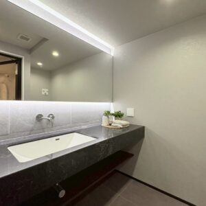 木目の温もりを基調に、上品なグレーやブラックをアクセントとして取り入れることで、洗練されたモダンスタイルを実現。寝室は柔らかな照明とファブリックで安らぎを演出し、水まわりはホテルライクな質感に仕上げるなど、暮らしの細部まで快適性を追求しました。シンプルでありながら質感豊かに、住む人の日常がより穏やかで豊かに感じられる空間を目指しています。