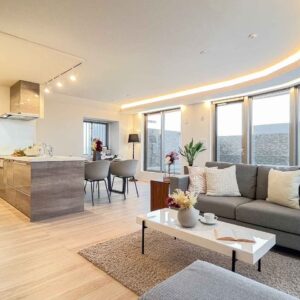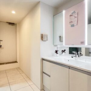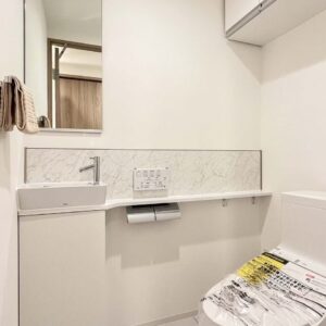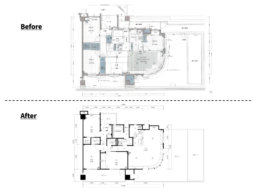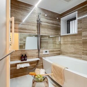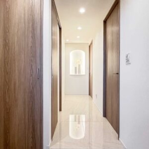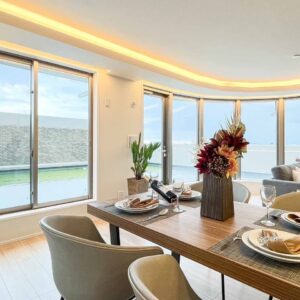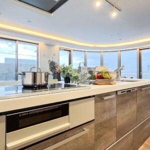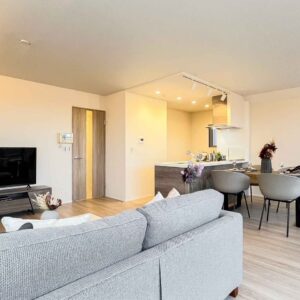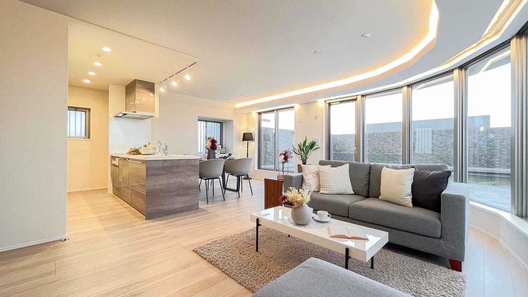 広々としたLDKに、やわらかな光が包み込むように広がるリノベーション事例です。天井にはカーブを描く間接照明を設け、空間全体に流れるような優しい光の演出をプラス。昼と夜で異なる雰囲気を楽しめる、上質で心地よいリビングダイニングに仕上げました。キッチンからはLD全体を見渡すことができ、家族やゲストとの会話も自然と生まれる開放的な空間構成です。玄関正面にはデザイン性の高いニッチを設け、訪れる人を迎える印象的なアクセントに。ディテールまで丁寧に設計された、暮らしの美しさを感じられる住まいです。